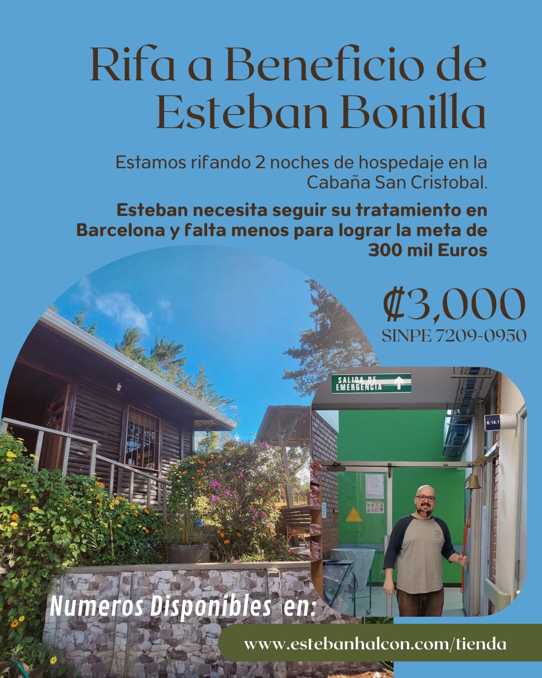 Por tu ayuda de un monto de 3,000 colones te regalamos 2 Noches de hospedaje para 4 personas en la Cabaña San Cristobal. La cabaña cuenta con 2 habitaciones con cama matrimonial. Esta totalmente equipidada y cuenta con internet por fibra optica. Ayuda a Esteban a lograr su objetivo de de realizar su tratamiento CAR-T…